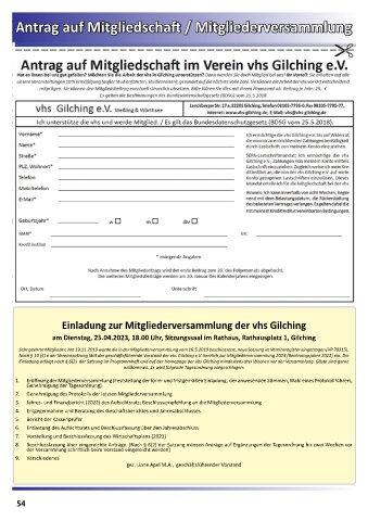 Nach § 10 (4) e der Vereinssatzung lädt der geschäftsführende Vorstand der vhs Gilching e.V. herzlich zur Mitgliederversammlung 2023 (Rechnungsjahre 2022) ein. Die